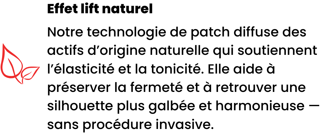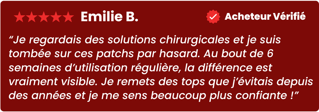 « Les patchs sont fins et souples, pas épais ni encombrants comme je le craignais. Je les porte environ 4 heures à chaque fois et je fais ça depuis 10 semaines maintenant. La différence est subtile mais réelle : on voit nettement plus de maintien et ils tombent beaucoup moins. Ils sont plus hauts qu’avant, donc ça fait clairement quelque chose ! »